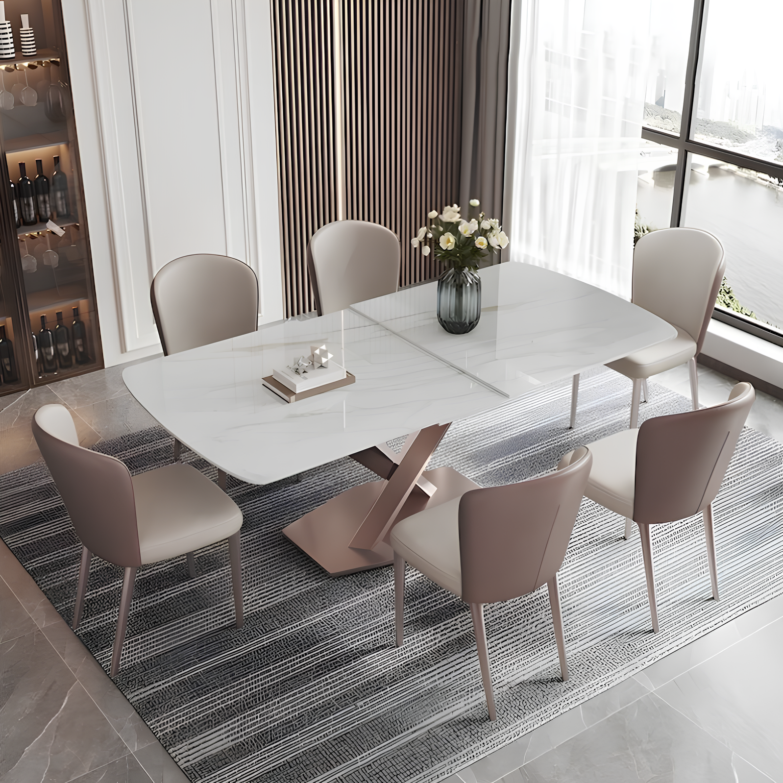Supported by a sturdy carbon steel base with a refined rose gold finish, the table offers strength and a sophisticated metallic touch. Designed for flexibility, it features an extendable surface that adapts effortlessly, perfect for intimate family meals or larger gatherings.