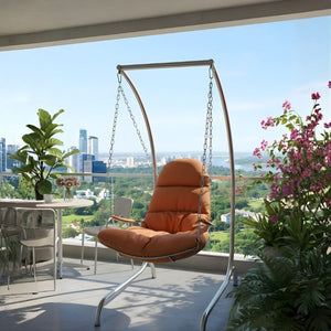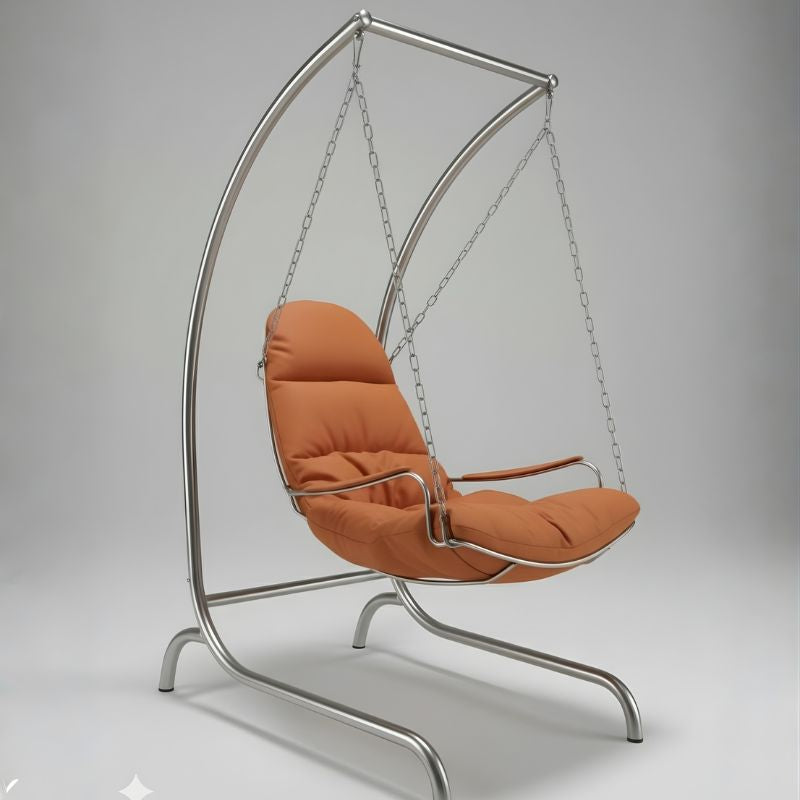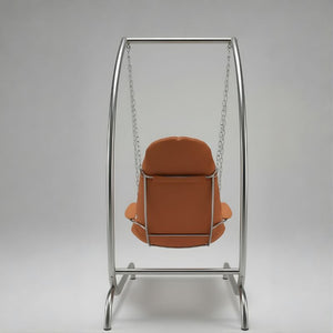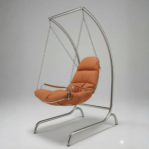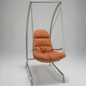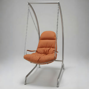 Crafted with a stainless steel hanger for superior strength and stability, the chair features a fabric seat upholstered in premium burnt orange leatherette, offering a luxuriously smooth and tactile feel. Its form is inspired by organic curves — a plush, circular seat paired with a gently domed backrest — delivering both comfort and visual sophistication.