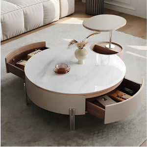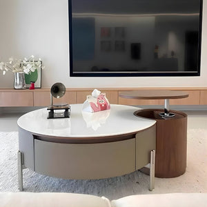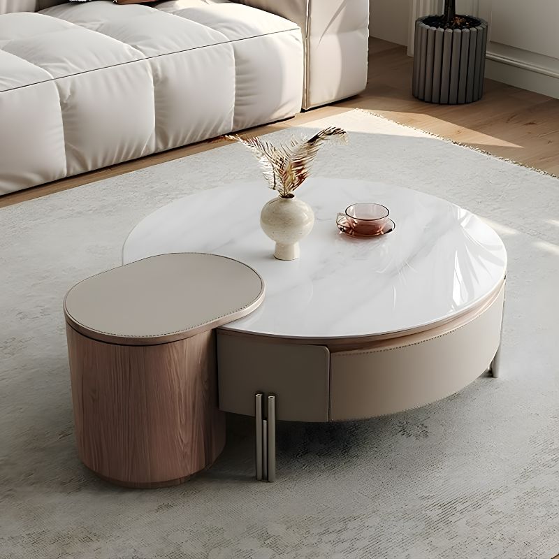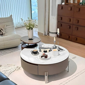 Built with a combination of engineered board and solid wood, the table ensures lasting strength and stability. Its drawer panels and trims, wrapped in premium saddle leather, add a soft, tactile richness that elevates the overall look. The tabletop, crafted from white marble-effect rock board, offers a sophisticated visual appeal while being resistant to stains and easy to maintain.