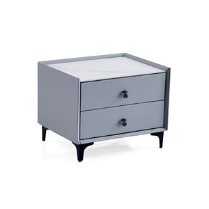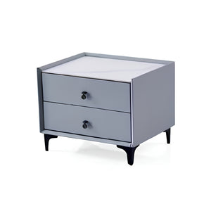 The matching side table complements the bed’s design with a luxurious blend of leather, wood, and rock board. Its marble-finish top adds elegance and easy maintenance, while sponge-padded drawer fronts and metal hardware detailing enhance both comfort and durability.