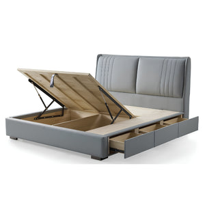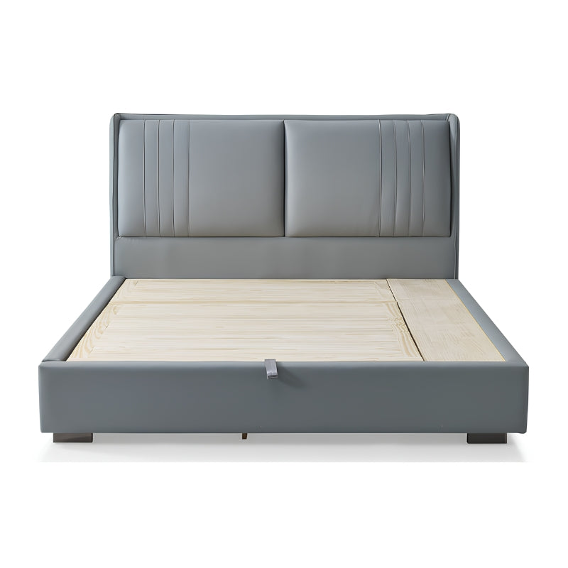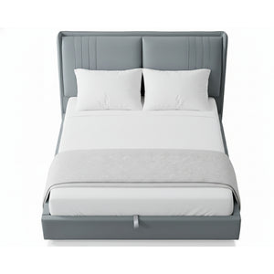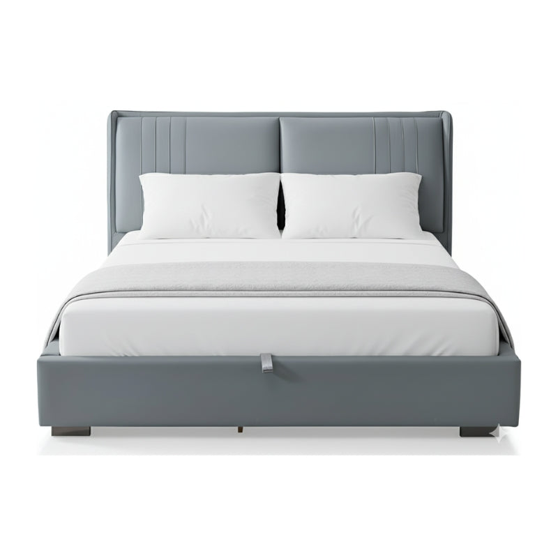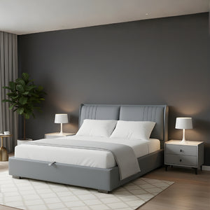 The bed’s headboard and frame are upholstered in premium light grey leatherette and cushioned with high-density sponge, ensuring a soft yet supportive surface. Its sturdy wooden frame and metal hardware provide lasting stability and smooth functionality, while the sleek silhouette enhances the aesthetic of any modern space.