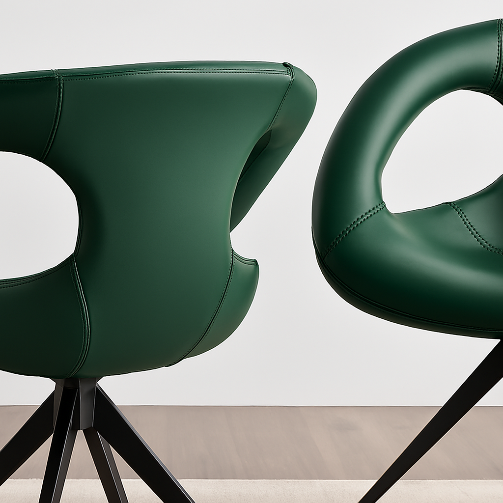 An open-back design with graceful cut-out detailing adds visual intrigue and lightness, while ensuring comfortable ergonomic support. Resting on a sleek, angular carbon steel base, the chair combines strength with contemporary sophistication.