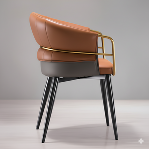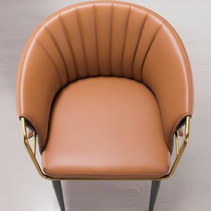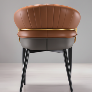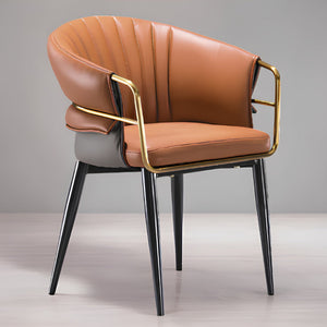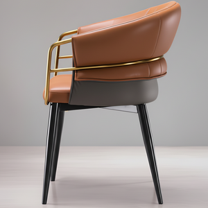 The rich caramel brown leatherette upholstery offers a luxurious texture and inviting warmth, beautifully contrasted by the matte black frame for a refined, modern appeal. Built on a sturdy base of black powder-coated metal accented with brushed gold details, the chair strikes the perfect balance between elegance and durability.