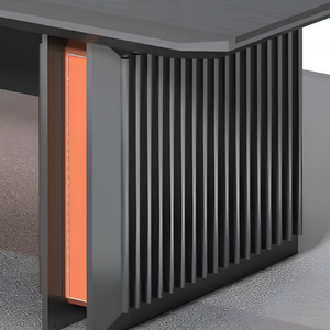 Its vertical slat base creates dynamic texture and depth, enhancing the sense of structure and stability in the room. The inner orange accent strip introduces a vibrant contrast, adding energy and character to the otherwise minimalist matte black body. This thoughtful touch not only enlivens the workspace but also reflects confidence and creativity.