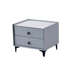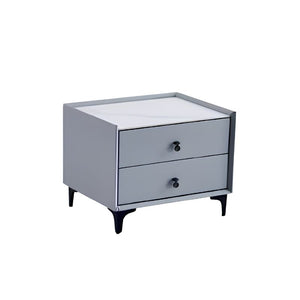 The side table, finished in light grey, perfectly complements the bed’s soft tones. Built with a solid wood structure for stability, it is upholstered in leatherette and detailed with sponge-padded drawer fronts for a refined tactile appeal. The top surface, made from elegant rock board with a marble-like finish, enhances both beauty and functionality. Sturdy metal hardware on the legs and handles adds a sleek, contemporary finish.