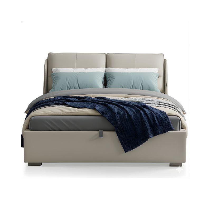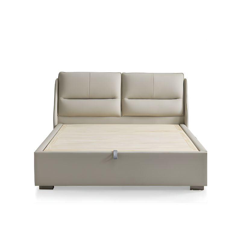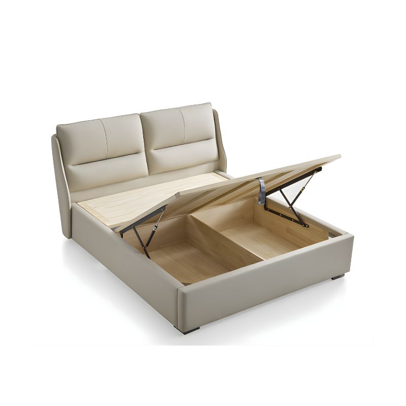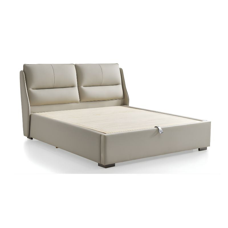 The bed features a sturdy wooden frame and platform, ensuring durability and long-lasting support. Its headboard and perimeter are luxuriously padded with high-resilience sponge and upholstered in light beige premium leatherette, offering a smooth, inviting feel. Complemented by metal hardware legs and handles, the design combines modern aesthetics with reliable strength and ease of use.