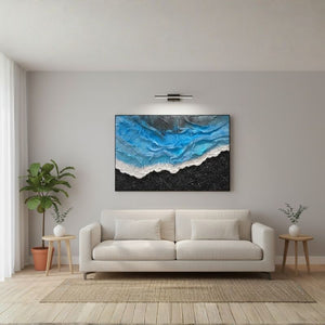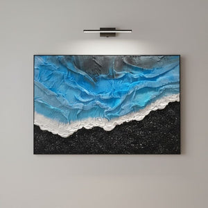 Crafted on a sturdy wood and canvas base, this hand-painted oil artwork evokes the serene tension of a shoreline — where deep blacks suggest volcanic sands, soft whites resemble sea foam, and luminous ocean blues capture the essence of flowing tides. The layered textures create both a visual and tactile gradient, encouraging the eye to drift gently across the surface like waves caressing the coast.